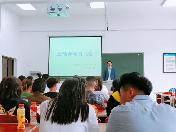 4月4日,计算机科学与工程学院在C-414教室召开2018年春季田径运动会动员大会。党总支副书记刘文菘,学工办主任兼团总支副书记袁颖到会。