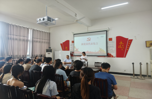 刘晶梅作为新党员代表进行发言,她表示入党是人生的重要起点,今后将更加严格要求自己,努力学习专业知识,积极参加党组织的各项活动,不断提高自身政治素养和业务能力,在学习和生活中发挥先锋模范作用,为学院的发展和党的事业贡献自己的力量。