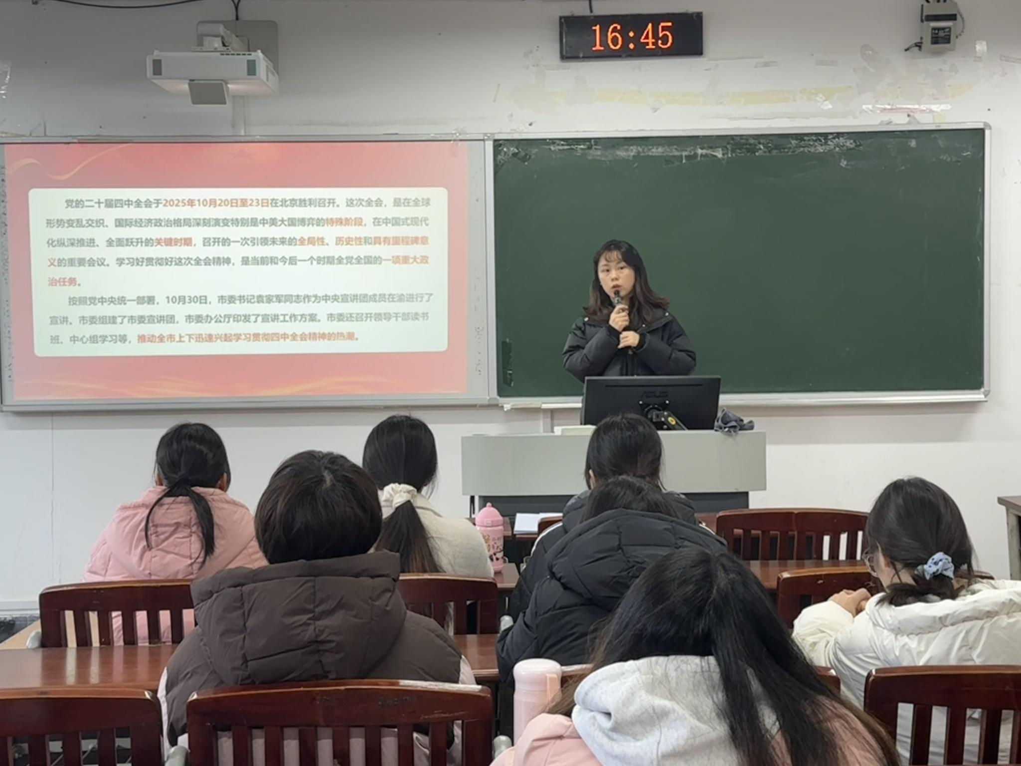 支部书记殷镭同志以“深入学习贯彻党的二十届四中全会精神”为题讲授党课,支部全体学生党员参与学习。